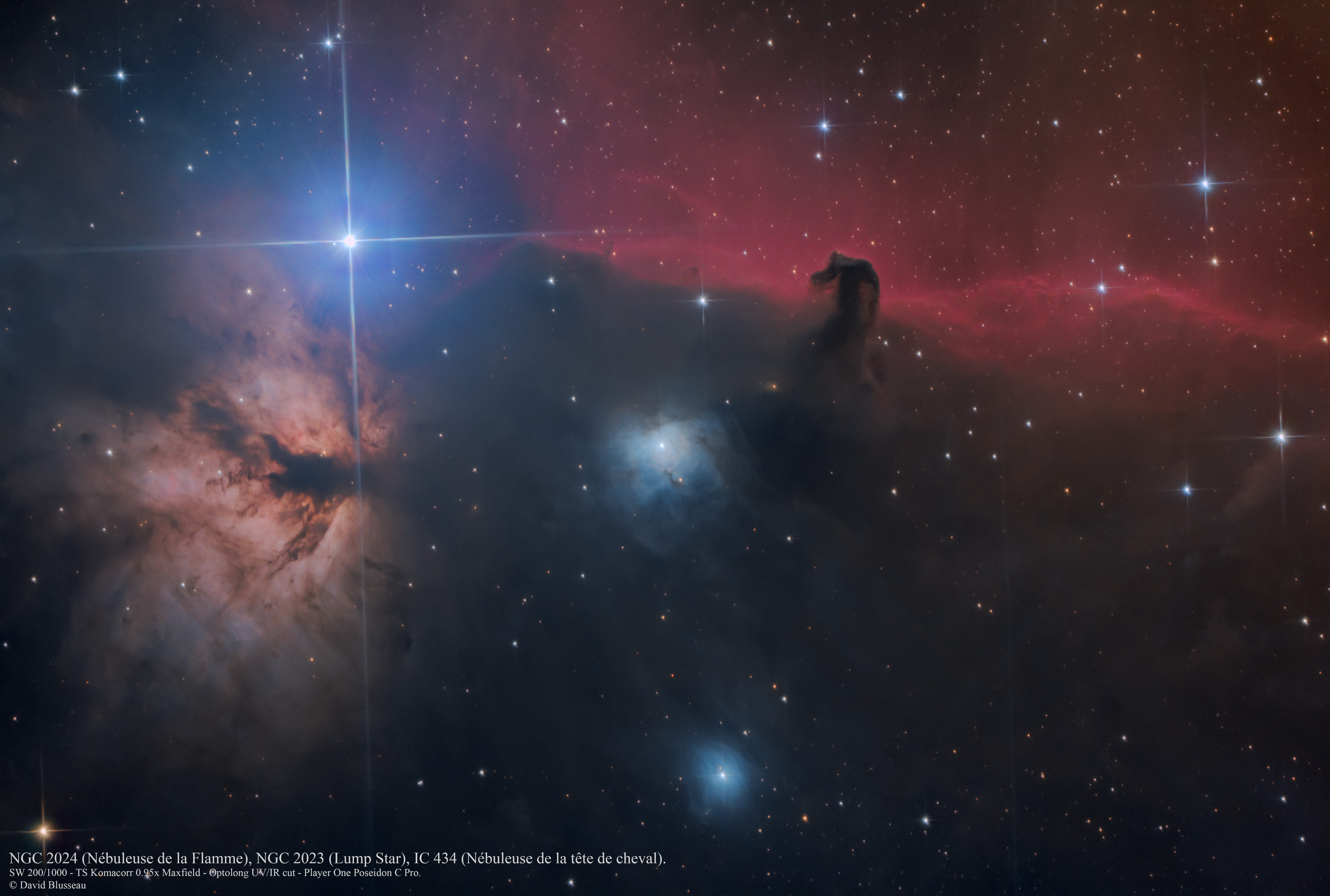 J'ai donc pu faire une petite sortie dans la nuit du Vendredi 05 au samedi 06 Janvier 2024 pour imager un classique du ciel profond situé dans la constellation d'Orion la Nébuleuse de la tête de cheval (IC 434) qui est une région HII, avec dans le même champ la Nébuleuse de la Flamme (NGC2024, amas associé à une nébulosité), NGC2023 (Lump Star, une nébuleuse par réflexion située entre les deux) et IC 435 (une autre nébuleuse par réflexion, située en bas de l'image).