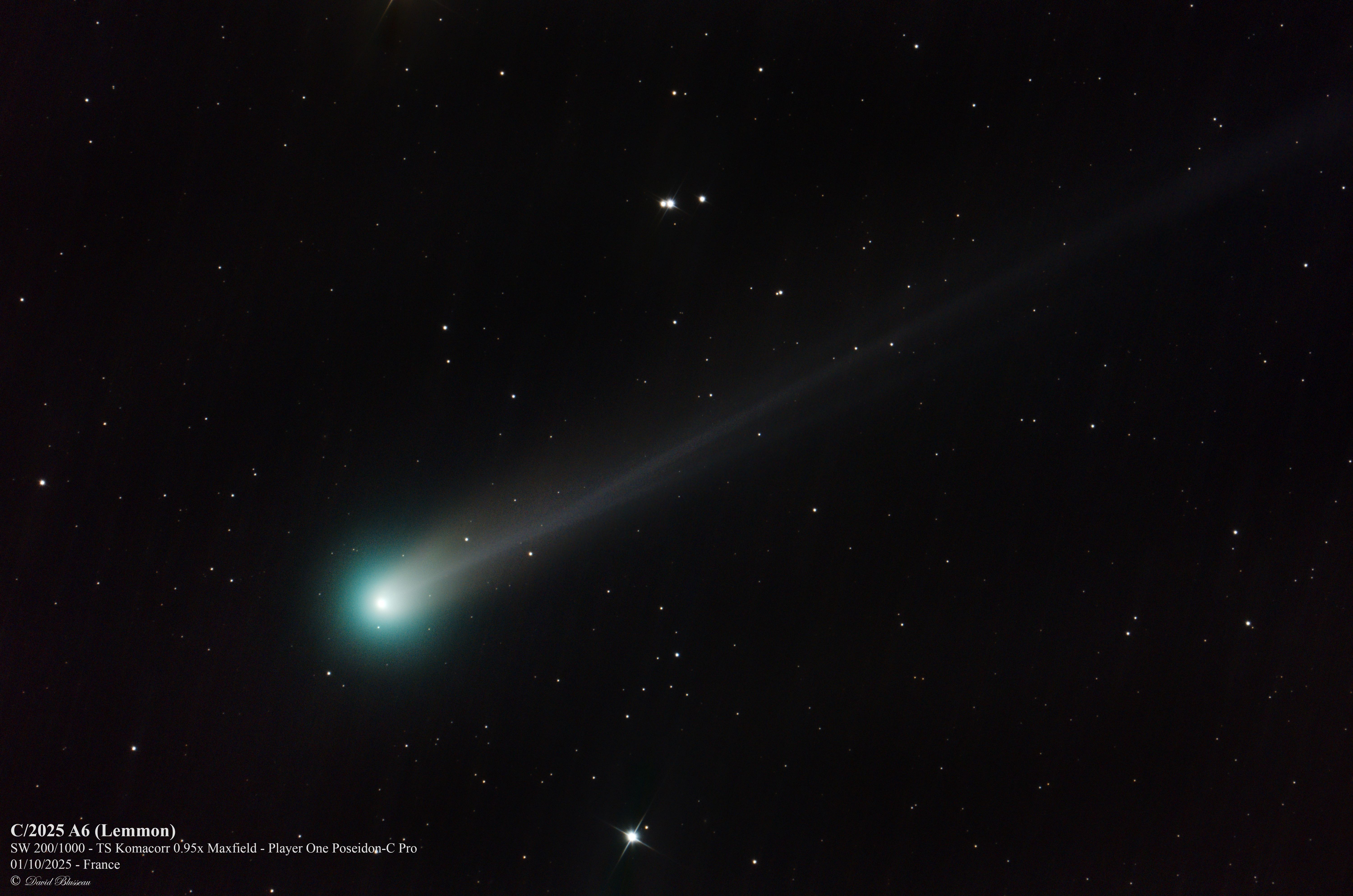 Pour cette première image cométaire de ce mois d'Octobre, il fallait se lever de bonne heure. C/2025 A6 (Lemmon), puisque c'est ainsi qu'elle se nomme, a été découverte en Janvier par le télescope Mont Lemmon Survey aux Etats-Unis. Elle est actuellement située dans la constellation de la Grande Ourse et commence à avoir une hauteur intéressante pour la photographie vers 04h du matin.