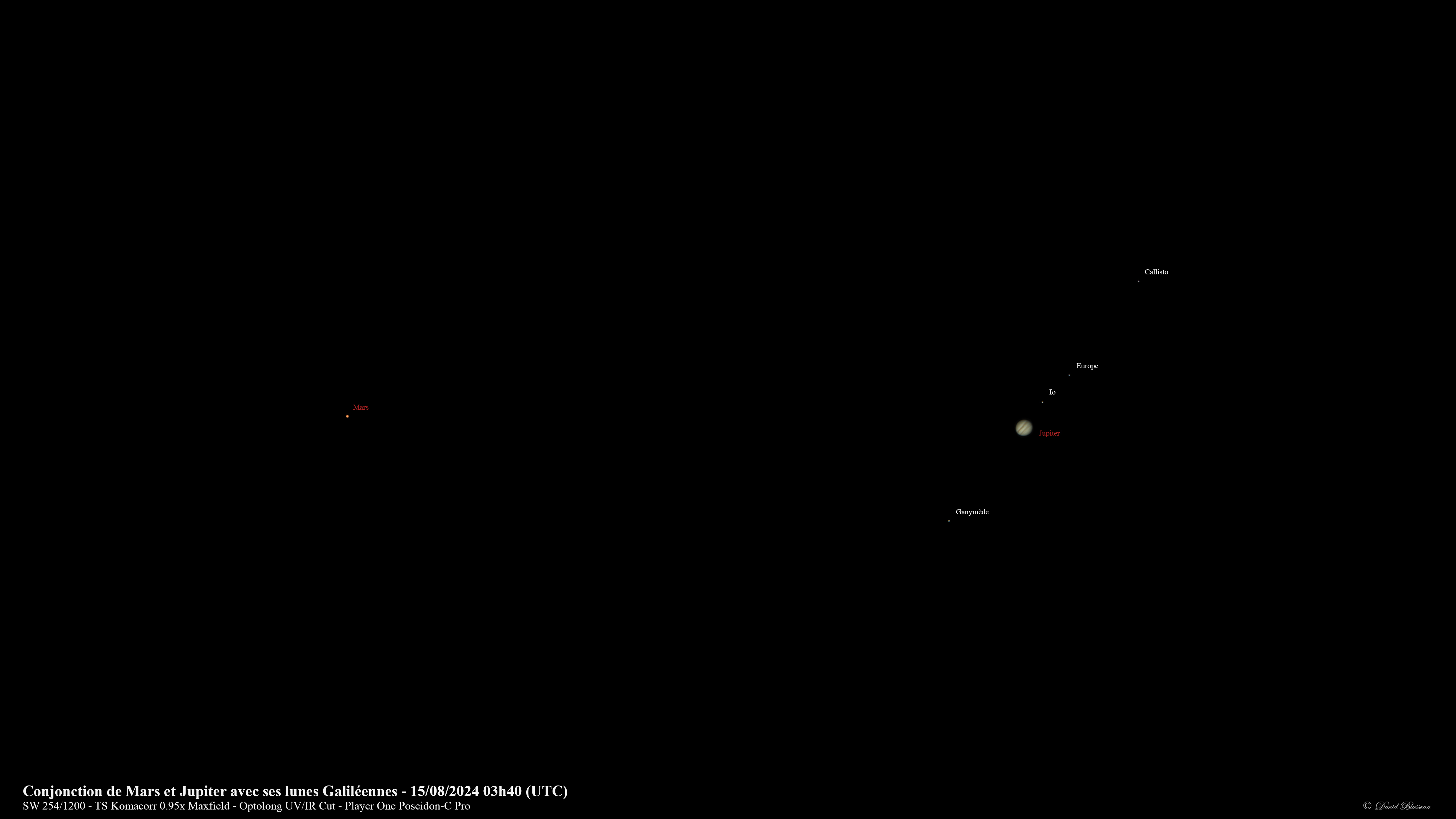 Vous l'aurez donc compris, hier avait lieu ce phénomène entre la planète Mars et Jupiter, à 15h21 UTC (17h21 heure locale) avec une séparation de 0,3° (source: le guide du ciel 2024 2025 de Guillaume Cannat). Cette Conjonction ne se réalise que tous les deux ans, et, cette année, la séparation est particulièrement mince (inférieure à un diamètre lunaire). Pour l'observer, il fallait se lever tôt, car, même si ces planètes se levaient peu après 1h30 du matin, le meilleur moment pour faire quelques images était pour moi un peu plus d'1h avant le levé du Soleil afin que ces planètes dépassent la cime des arbres qui bordent ma propriété.