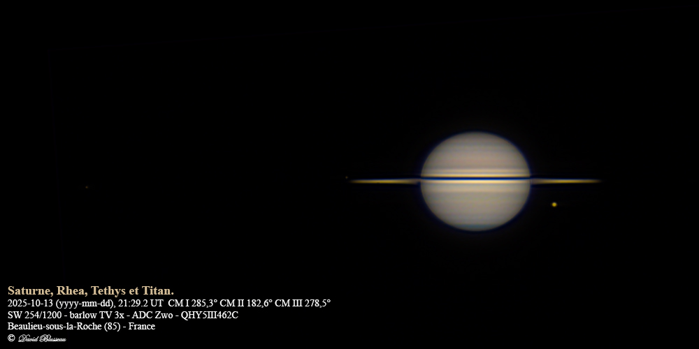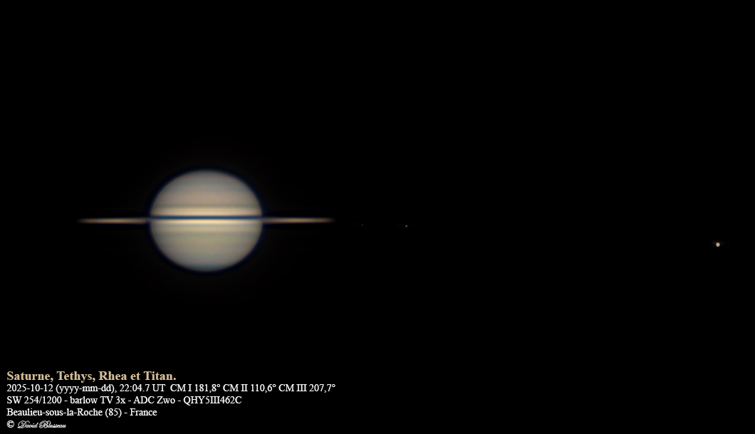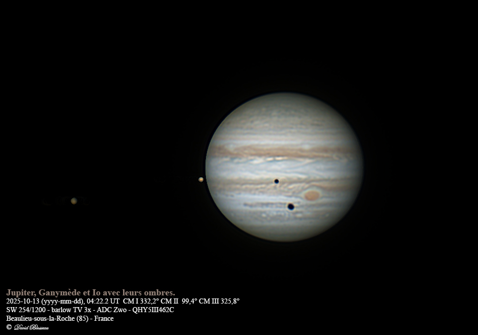Le seeing était très moyen et cela se ressent sur les photos, en particulier pour Saturne. Cette soirée avait pour particularité la projection de deux ombres sur le disque de Jupiter, celles de Ganymède (la plus à gauche) et de Io. Voici les meilleurs clichés pour cette nuit.