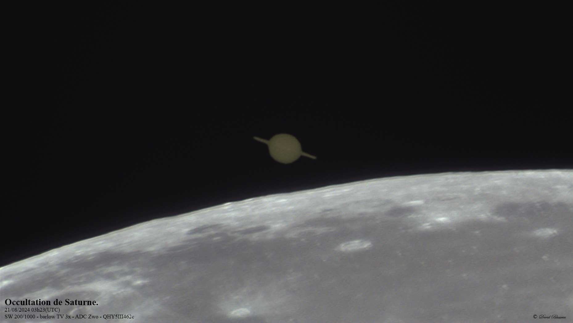 Le Mercredi 21 Août 2024 avait lieu un phénomène remarquable : l'occultation de Saturne par la Lune. Voici une petite chronique sur cet évènement.