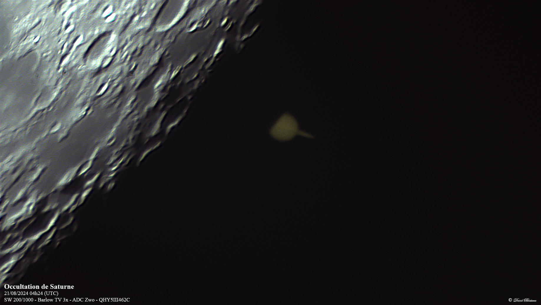 L'occultation de Saturne par la Lune avait donc lieu ce Mercredi matin vers 05h24 heure locale. C'est un phénomène assez rare, qui ne se produit que tous les 3 à 5 ans, et n'est pas toujours visibles depuis la France. J'avais donc pour l'occasion sorti mon newton de 200mm pour immortaliser ce moment.