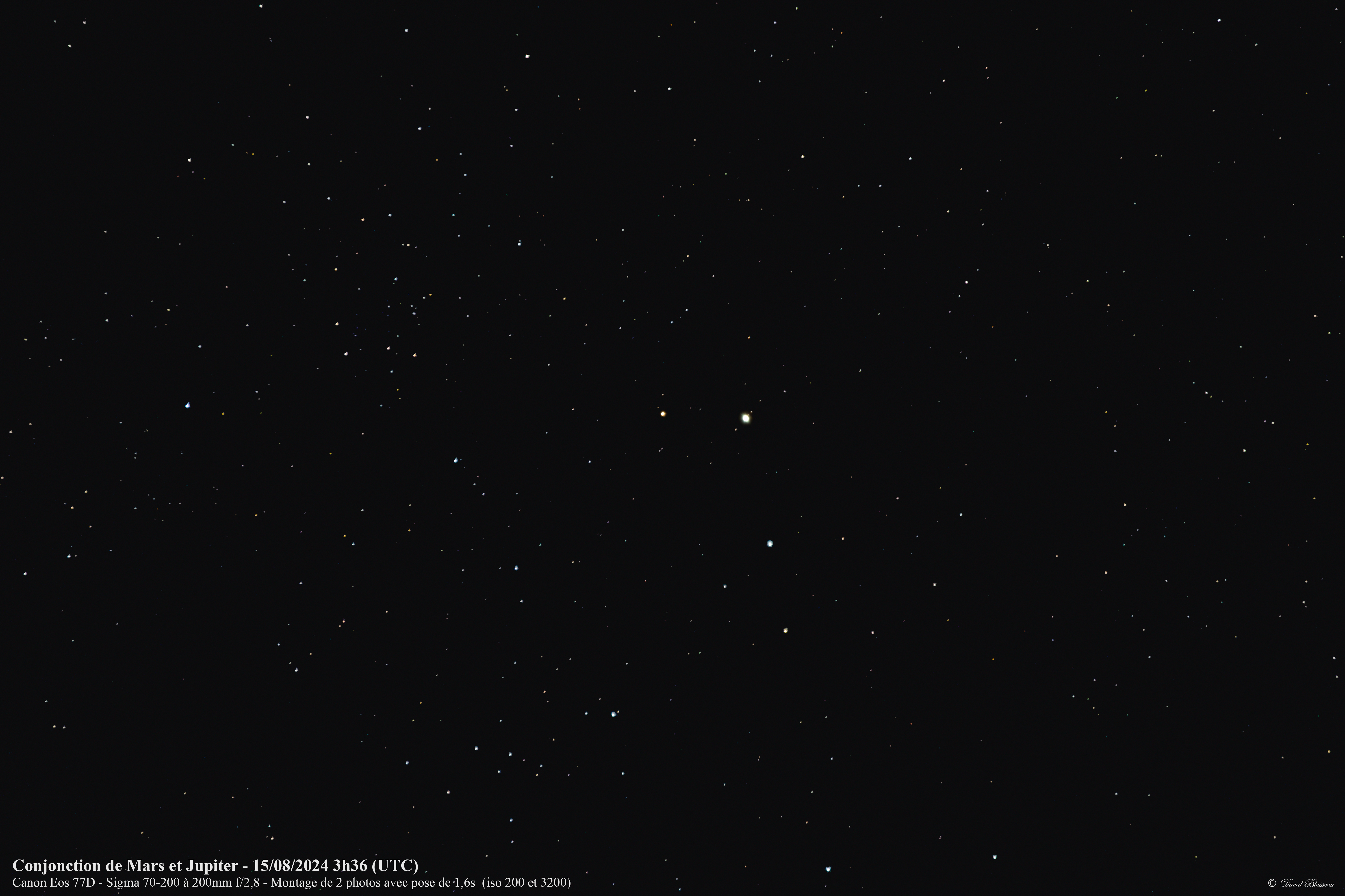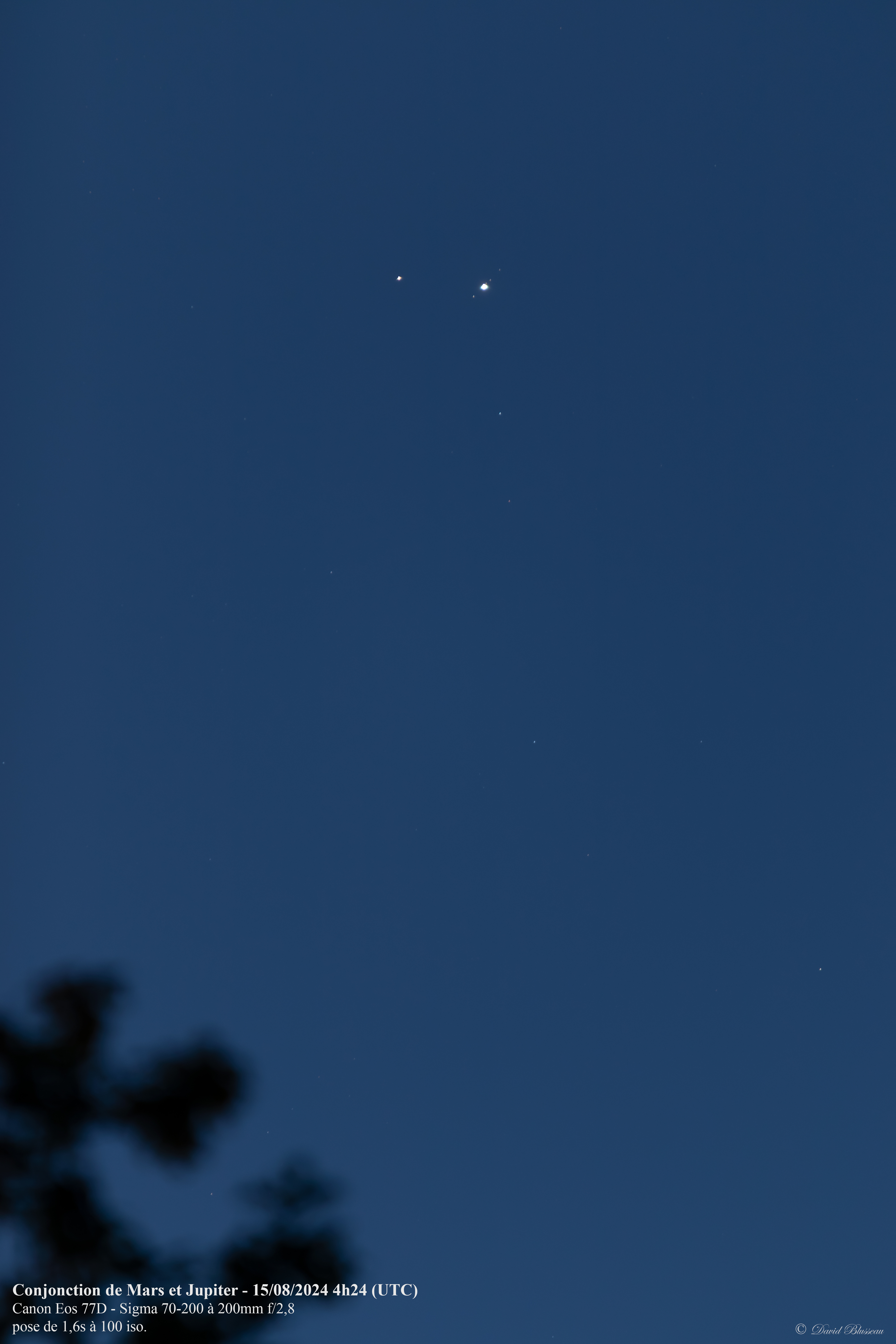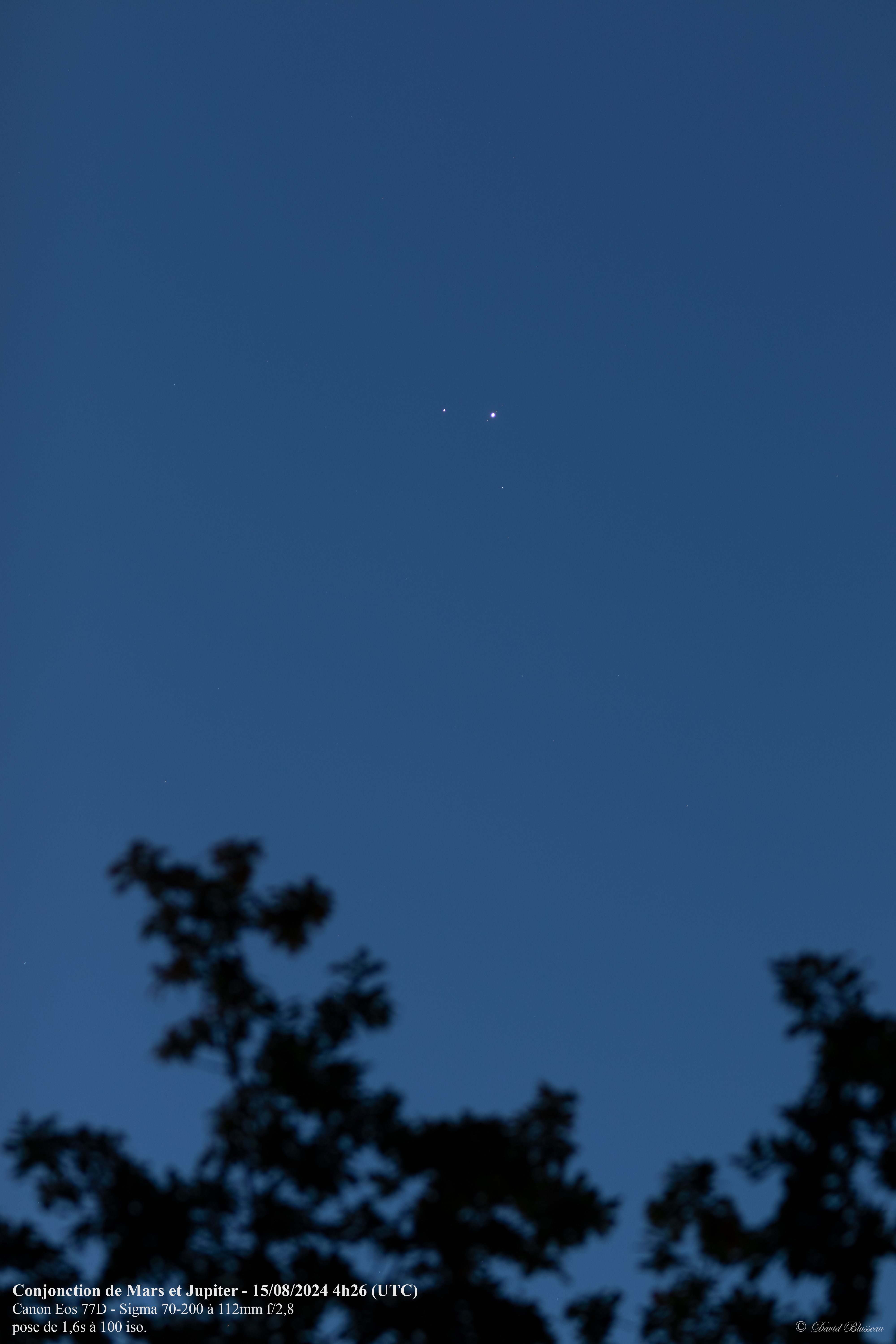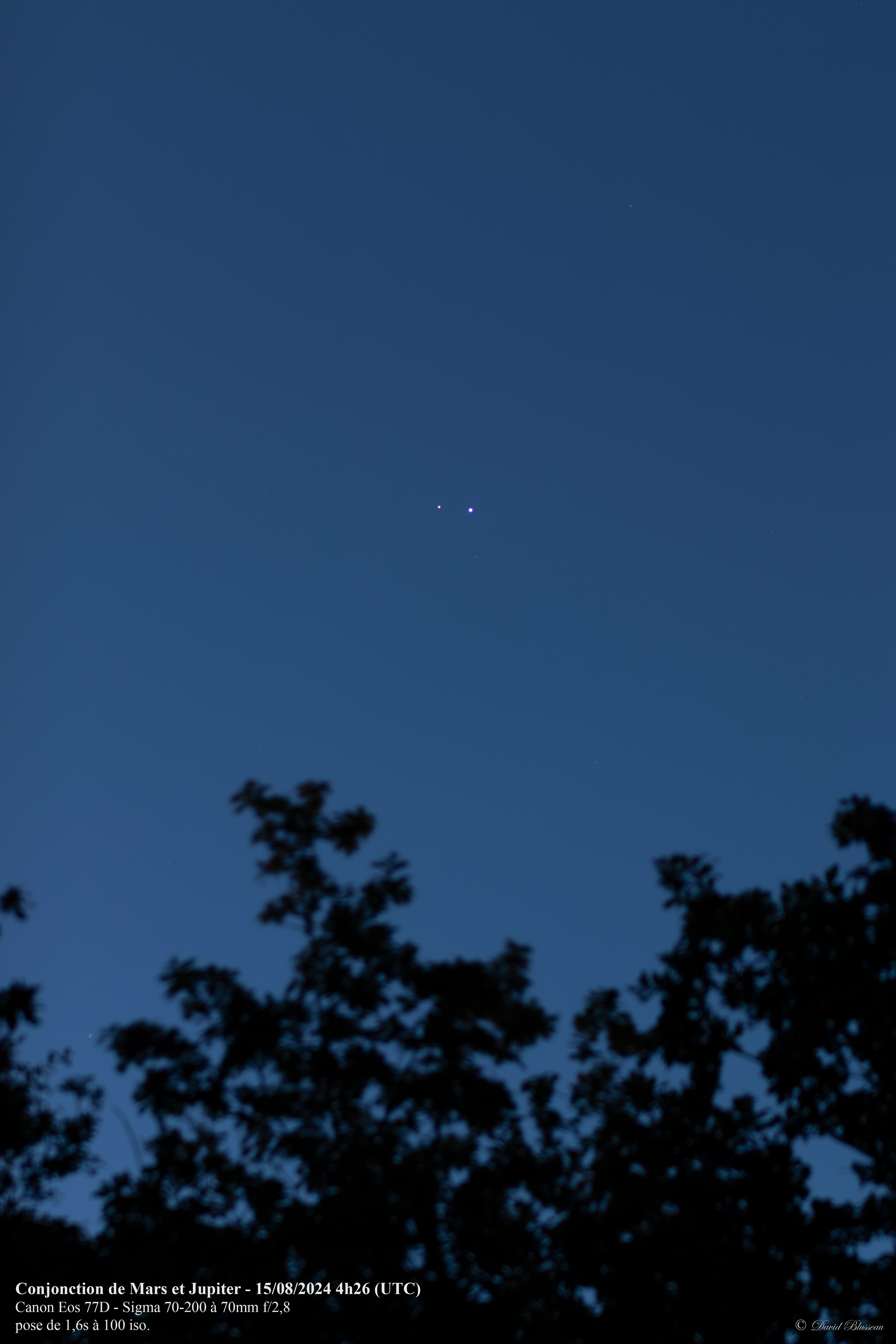 Vous l'aurez donc compris, hier avait lieu ce phénomène entre la planète Mars et Jupiter, à 15h21 UTC (17h21 heure locale) avec une séparation de 0,3° (source: le guide du ciel 2024 2025 de Guillaume Cannat). Cette Conjonction ne se réalise que tous les deux ans, et, cette année, la séparation est particulièrement mince (inférieure à un diamètre lunaire). Pour l'observer, il fallait se lever tôt, car, même si ces planètes se levaient peu après 1h30 du matin, le meilleur moment pour faire quelques images était pour moi un peu plus d'1h avant le levé du Soleil afin que ces planètes dépassent la cime des arbres qui bordent ma propriété.