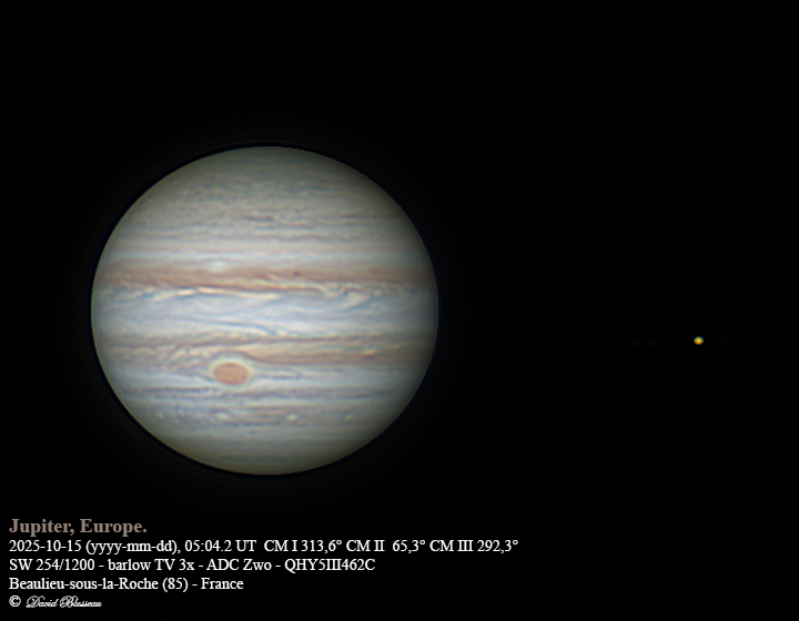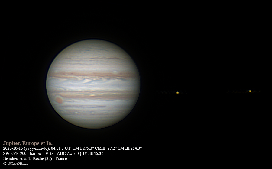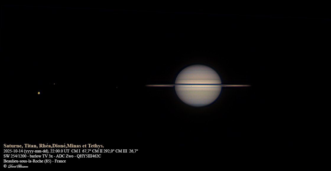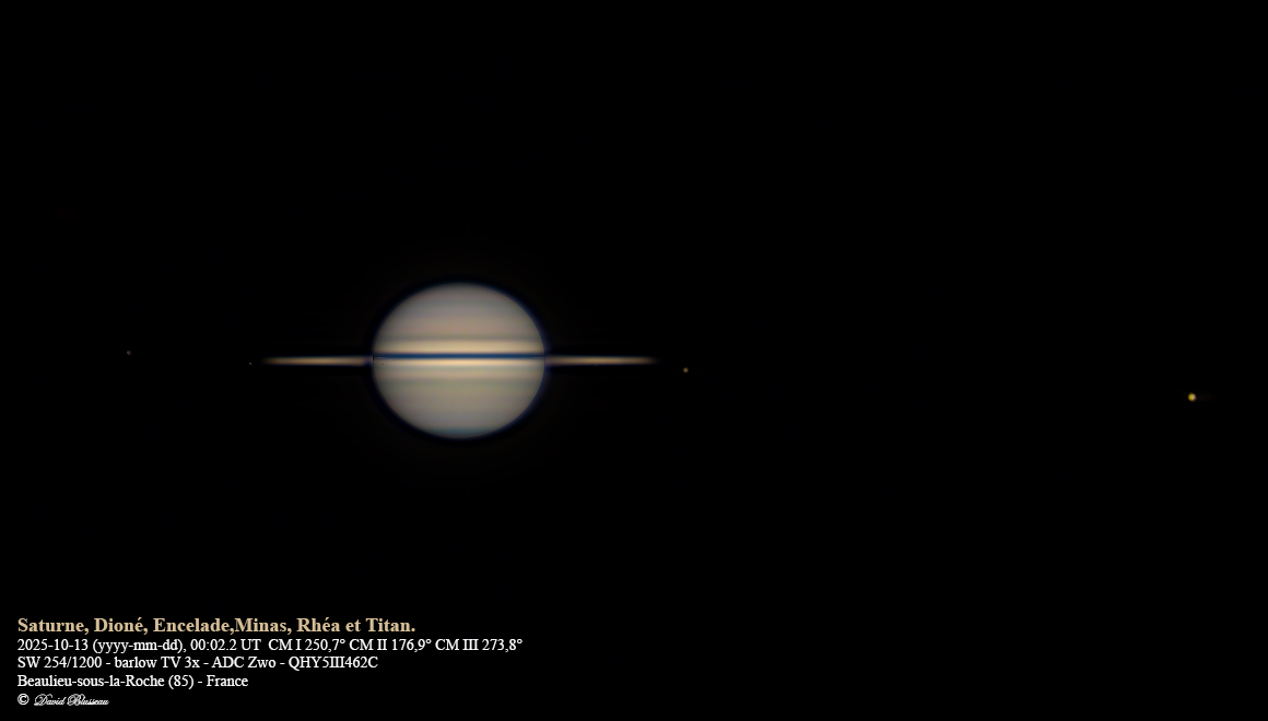 Le seeing était très moyen et cela se ressent sur les photos, en particulier pour Saturne. Cette soirée avait pour particularité la projection de deux ombres sur le disque de Jupiter, celles de Ganymède (la plus à gauche) et de Io. Voici les meilleurs clichés pour cette nuit.