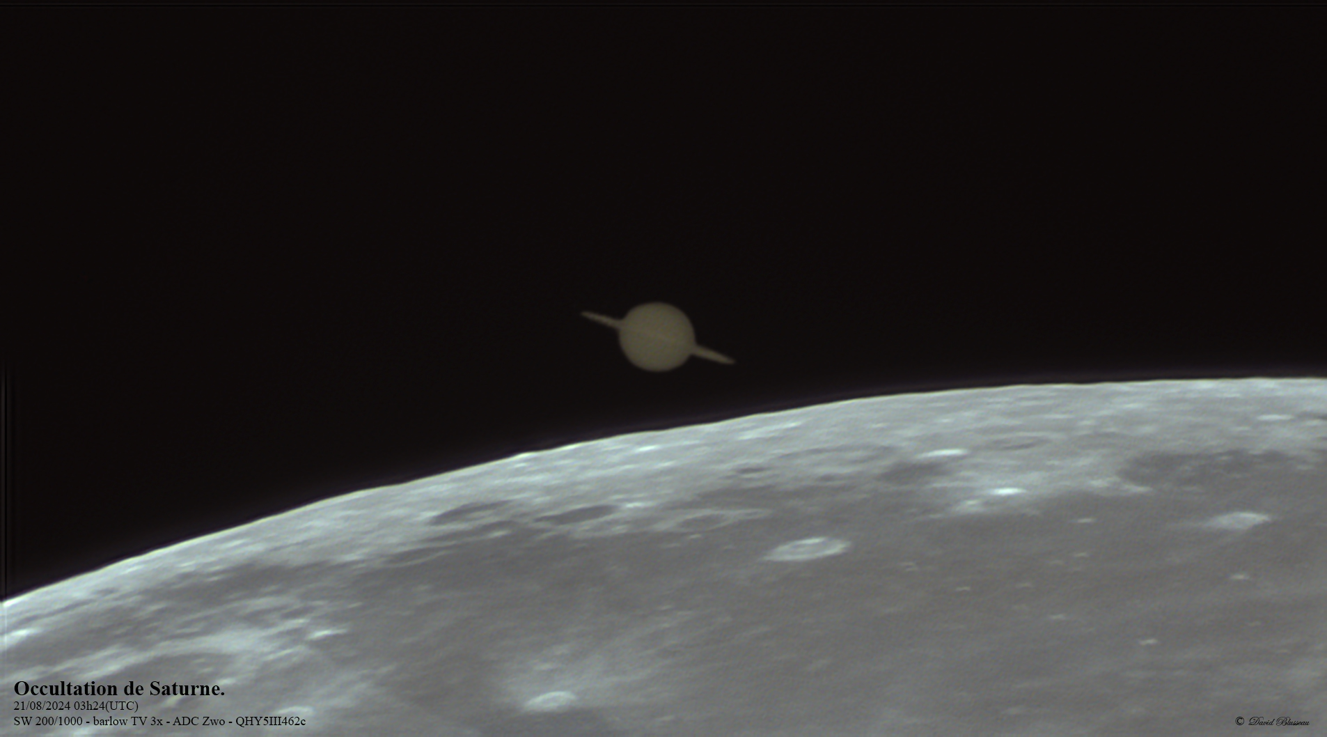 Le Mercredi 21 Août 2024 avait lieu un phénomène remarquable : l'occultation de Saturne par la Lune. Voici une petite chronique sur cet évènement.