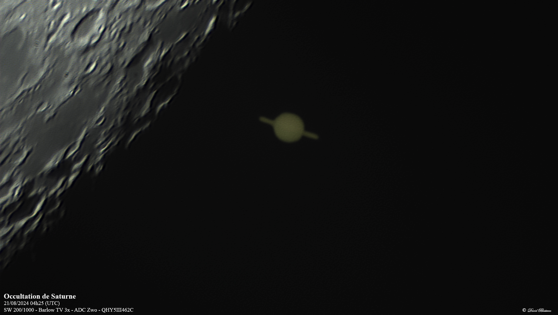 L'occultation de Saturne par la Lune avait donc lieu ce Mercredi matin vers 05h24 heure locale. C'est un phénomène assez rare, qui ne se produit que tous les 3 à 5 ans, et n'est pas toujours visibles depuis la France. J'avais donc pour l'occasion sorti mon newton de 200mm pour immortaliser ce moment.