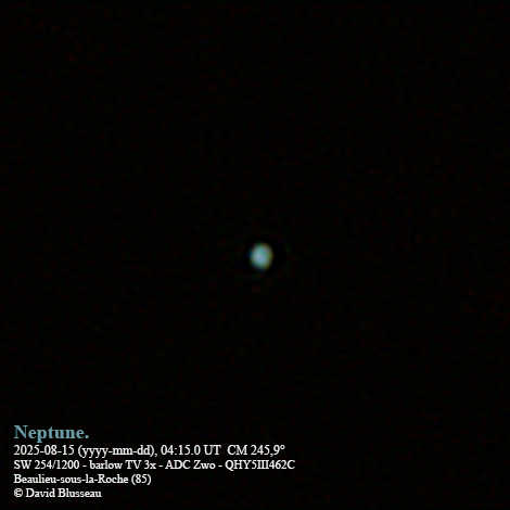 En bonus, j'ai shooté Neptune qui était juste à côté. C'est une image qui ne montrera aucun détail de la planète, celle-ci étant beaucoup trop éloigné de nous, et mon matériel trop modeste. Traitement d'un seul film SER de 300s.