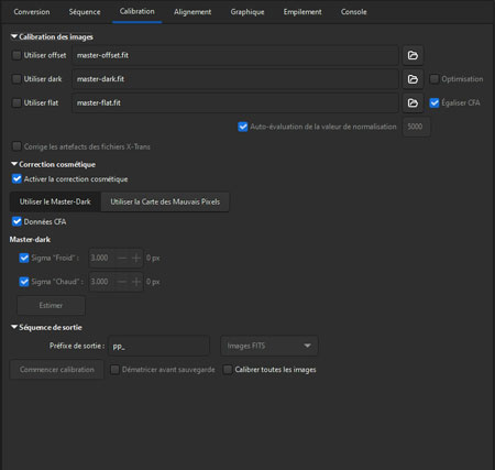 Il faut au préalable, si l'on possède un dark-maître et un flat-maître, les sélectionner sous l'onglet "callibration".